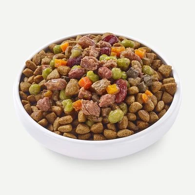 Sabroso complemento alimenticio para perros, natural y rico en humedad para el pienso, con carne auténtica y muchas proteínas, con verduras nutritivas, sin cereales ni aditivos