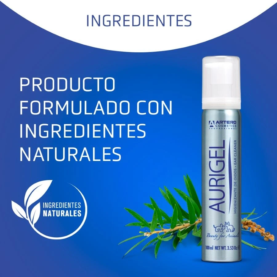 Higienizante de oídos en forma de gel que facilita con precisión la aplicación, ya que una vez en contacto con la piel se licua provocando una rápida penetración y emulsificación del exceso de cera y suciedad. Gracias a un tensoactivo no iónico extremadamente suave limpia respetando el equilibrio epidérmico. Contiene entre otros ingredientes: Tee Tree Oil o aceite de las hojas del árbol de Melaleuca Al ternifolia (conocido popularmente como «Arbol de Té Australiano»). Es un aceite esencial germicida penetrante, bacteriostático, descongestionante y, junto a su efecto repelente de insectos y parásitos, lo hacen idóneo como principio activo en la formulación del Artero Aurigel. Modo de uso: Para la limpieza del pabellón auricular, aplicaremos una o dos pulsaciones de Artero Aurigel sobre una toallita o gasa estéril, procediendo a limpiar siempre de la zona interior hacia la exterior, teniendo especial cuidado en los pliegues y surcos del cartílago. Para la limpieza del canal auditivo aplicaremos una cantidad suficiente de Artero Aurigel dentro del canal sin que llegue a rebosar, seguidamente, efectuar un masaje en la base de la oreja y así favorecer su emulsión con la suciedad y la acción ceruminolítica. El propio animal expulsará la emulsión hacia el exterior, retiraremos ésta con una toallita o gasa estéril seca. Nunca utilizaremos bastoncillos con punta de algodón ya que podríamos provocar un empuje de suciedad, con resultados contrarios a los deseados. La frecuencia del uso está determinada por el propio animal (tipo de raza, características del entorno en el que vive, etc.) por lo general basta con una aplicación de Artero Aurigel semanalmente para mantener una correcta higiene.