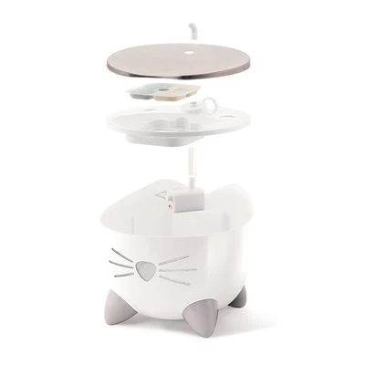El bebedero fuente Catit PIXI anima al gato a beber. Su filtro de triple acción elimina las partículas de suciedad y los olores del agua y ablanda el agua del grifo. El bebedero tiene tres ajustes del flujo de agua a elegir: flujo suave, corriente silenciosa o agua burbujeante. La bomba del bebedro es silenciosa y de bajo consumo. Además, está equipado con un sensor que activa un cierre automático cuando el nivel de agua es muy bajo.