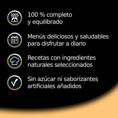 Deliciosa comida húmeda para perros, sin colorantes, aromatizantes ni azúcares. Aporta vitaminas y minerales esenciales y resulta fácilmente digestible. Cortes tiernos en exquisito paté. Sin aditivos