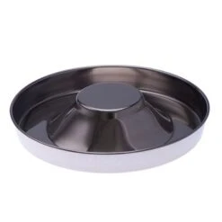 Comedero de acero fino con elevación en el centro para que los cachorros no salten encima. Suficientemente grande para que coman varios animalitos y, a la vez, es bajo para que puedan acceder a él.