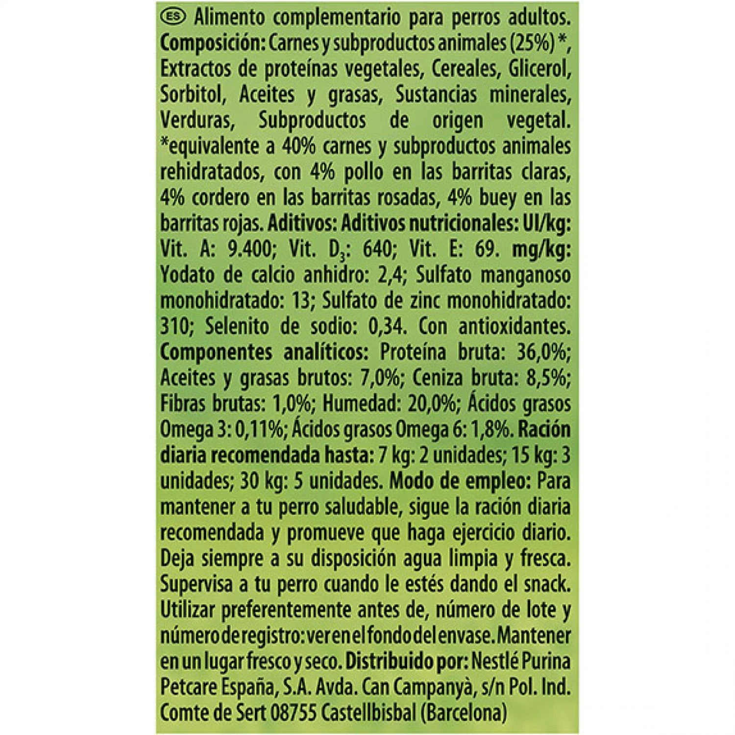 *equivalente a 40% Carnes y subproductos animales rehidratados. Con mín. 26% carnes, mín. 4% pollo en las barritas claras, mín. 4% cordero en las barritas rosadas, mín. 4% buey en las barritas rojas.