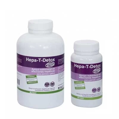 Suplemento nutricional de apoyo a la función hepática en perros y gatos. Hepa-T-Detox aporta antioxidantes y aminoácidos necesarios para los animales que sufren problemas hepáticos. Favorece el proceso de eliminar toxinas y regenerar las células del hígado. Presentación: 60 comprimidos.