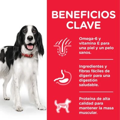 Pienso para perros adultos medianos de 1 a 6 años de edad. Con proteínas de alto valor nutritivo y de fácil digestión. Con ácidos grasos omega-3 y omega-6 para una piel y un pelo sanos.