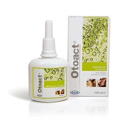 Potente limpiador de oídos que disuelve de manera eficaz el cerumen del canal auditivo. Otoact mantiene limpios los oídos de tu mascota, evitando acumulaciones excesivas de cera. Es seguro y no tóxico, puede usarse en animales con el tímpano perforado. Apto para perros y gatos. Formato: 100 ml.