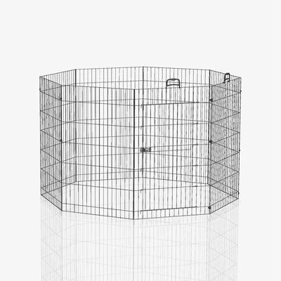Parque plegable de acero con 8 piezas individuales que se pueden montar según necesidad. Para animales pequeños. Con puerta integrada y asas de plástico extraíbles. Color negro.