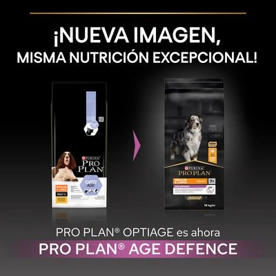 PURINA PRO PLAN Medium & Large Adult 7+ Age Defence (antes: OPTIAGE) es un pienso completo para perros mayores de tamaño mediano y grande. El contenido de grasas y proteínas es adaptado, las proteínas proceden de los trocitos de pollo de alta calidad. Además, contiene ácidos grasos omega esenciales, necesarios para el funcionamiento normal del cerebro y el metabolismo de las articulaciones, entre otros.