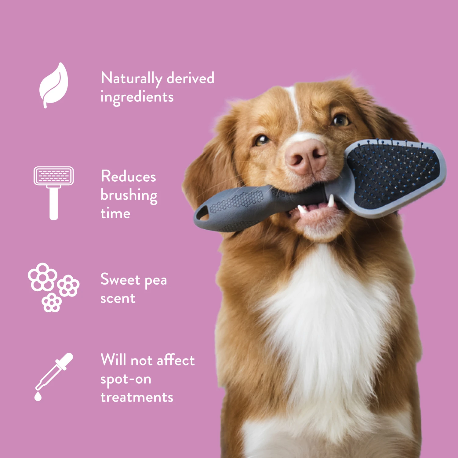 Spray desenredante para perros de cualquier raza. Tropiclean elimina los enredos del pelo, repele la suciedad y facilita el cepillado. También proporciona mayor brillo y elasticidad para el pelaje. No elimina el efecto antiparasitario. Contenido: 473 ml.