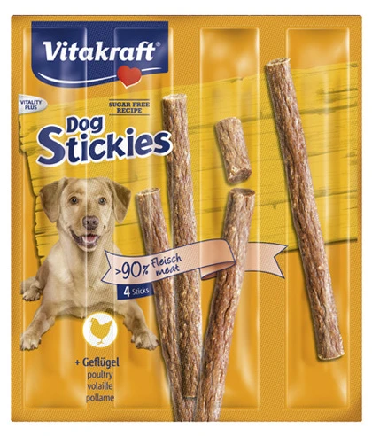 Snack de carne para perros con deliciosa mezcla de aves. Vitakraft Dog Stickies son barritas flexibles y fáciles de dividir, ideales como recompensa durante el adiestramiento. Receta sin azúcar. Contenido: 4 unidades (44 gr).